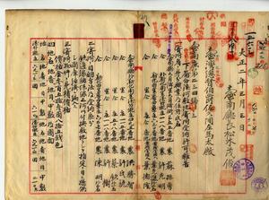 八 蘇振芳・許光明・葉先進外二名[未記載]・葉徳隆・洪勝智・許氏説・蔡欽外一名[未記載]・許樹・陳明外三名[未記載]ヨリ港仔茄庄・蕃仔椙庄ノ田ヲ鉄道線路保線上河川付換敷地トシテ寄附ニ付キ台南庁長松木茂俊ヨリ受納方報告ノ件