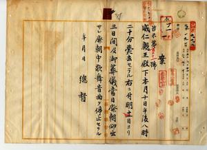威仁親王殿下薨去ニ付廢朝及歌舞音曲停止(告示第百三十一號)、故威仁親王殿下ノ御葬儀期日(告示第百三十二號)