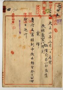 四 台湾総督府学務部長心得隈本繁吉ヨリ台湾総督府国語学校訓導・台湾公学校訓導ヲシテ教員タルノ威厳ヲ保タシムルト教授上動作ノ敏活ヲ得シムルト儀式ニ際シテモ礼意ヲ失スルカ如キコト無カラシメン為服制ヲ定ムルノ必要アルヲ以テ台湾総督府国語学校訓導及台湾公学校訓導服制制定方稟申ヲ基ニ官吏待遇職員ニシテ職務ノ性質上威厳ヲ要スル者ニハ制服ヲ着用セシムルノ必要ヲ認メタルニ依リ台湾総督府文官服制中改正ノ件(勅令第一七号)