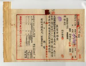 一二 大阪商船株式会社基隆支店(寄付金二〇〇〇円、台北庁基隆堡基隆街)・鈴木よね(寄付金二〇〇〇円、平民・兵庫県神戸市栄町)・林本源代表者林熊徴(寄附金一〇〇〇円、台北庁擺接堡枋橋)ヨリ討蕃隊慰問ノ為メ金員寄附ニ付賞勲局総裁へ褒賞申牒ノ件