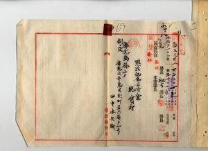 四 勤務中ノ事故ニヨリ負傷シ台北医院ニテ官費治療シタルモ左手前膊下切断シ不具者トナリタルニヨリ運転ノ職務ニ復スルコト能ハサルヲ以テ依願退官シタル元台湾総督府鉄道部技手基隆機関庫詰汽車課所属機関手取締技手田中休兵衛ノ請求ニヨリ恩給証書ヲ鹿児島県庁ヘ送付ノ件