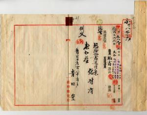 三 明治四五年一月新竹庁ロウブゴウ山方面隘勇線ニ於テ敵蕃ト衝突ノ際顱頂部貫通銃創兼頭蓋陥凹骨折ノ為メ退官シタル元新竹庁警部補青田豊ノ請求ニヨリ恩給証書ヲ台北庁ヘ送付ノ件
