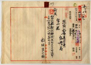 一二 疾病ニ罹リ退官シタル元台湾総督府専売局書記稲垣良之助ノ請求ニヨリ恩給証書ヲ富山県ヘ送付ノ件