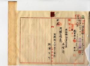 七 在官中風土病ノ熱帯性麻刺里亜等ニヨリ死亡セシ故阿緱庁事務官松浦石太郎寡婦松浦フリヨリノ官吏遺族扶助料下賜願ニヨリ遺族扶助料証書ヲ阿緱庁ヘ送付ノ件