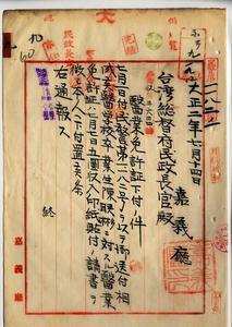 九 嘉義庁打猫南堡好收庄土名好收ノ台湾総督府医学校卒業生ノ陳聯彬ヨリ医業開業ノ為メ医業免許証下附願出ニ付キ医業免許証下付シタルヲ以テ嘉義庁長ヘ交付方通牒並ニ処理方嘉義庁ヨリ通報ノ件