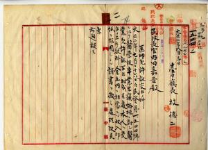 一一 台中庁藍興堡台中街ノ台湾総督府医学校卒業生ノ蘇炳垣ヨリ医業開業ノ為メ医業免許証下付願出ニ付キ医業免許証下付シタルヲ以テ台中庁長ヘ交付方通牒並ニ処理方台中庁長枝徳二ヨリ通報ノ件