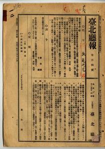 一二 第二号 明治三六年一〇月台湾総督府府令第六九号第一条第二項ニ依リ明治三三年法律第一五号飲食物其ノ他ノ物品取締ニ関スル事項施行方ノ件一二-一 台北庁・宜蘭庁・新竹庁・南投庁・嘉義庁・阿緱庁ノ庁令供閲ノ件