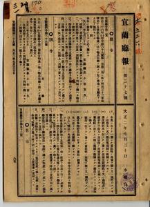 三一 第二六号 大正二年七月宜蘭庁令第二号飲食物其ノ他ノ物品取締ニ関スル支庁長取扱事項施行手続制定ノ件