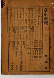 一六 第一六号 台南庁台南市万福庵街戊呉金榜ハ雑貨行商鑑札ヲ、馬公廟街乙ノ顔河ト七良境街丁ノ和泉亀太郎ハ菓子行商鑑札ヲ、李元順・富山朝輔・宮本重助・楊新智ハ自転車鑑札ヲ紛失ニ付キ各鑑札ヲ無効トス