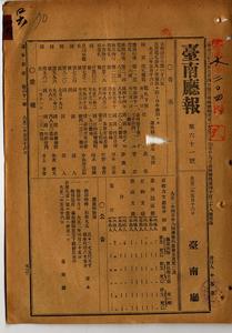 四六 第四六号 台南庁台南市下太子街丙ノ曽意ハ醤油行商其鑑札ヲ、清水寺街乙ノ許清泉ハ果物行商鑑札ヲ、竹巷口街巳ノ河本石造ハ飲食物行商鑑札ヲ、苓雅藔区苓雅藔庄ノ佐野金吉ト打狗区塩埕町ノ時本留蔵ハ小間物行商鑑札ヲ、中島新之助・末次数夫・井上音吉ハ自転車鑑札ヲ紛失ニ付キ各鑑札ヲ無効トス