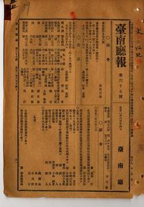 五五 第五五号 台南市竹仔街戌ノ宮崎庄村上和三郎ハ呉服行商鑑札ヲ、太子街丙ノ陳后ハ飲食物行商鑑札ヲ、小竹上里大樹脚庄ノ黄江ハ煙草小売営業鑑札ヲ、大竹里旗後街ノ李天助ハ食塩請売鑑札ヲ、小原林治・蘇光顕・張紹齢ハ自転車鑑札ヲ紛失ニ付キ各鑑札ヲ無効トス