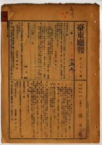 明治三十六年府令第六十九號ニ依リ同三十三年法律第十五號飲食物其他ノ物品取締ニ關スル事項ハ支廳長ヲシテ施行セシム(臺東廳廳令第一號)