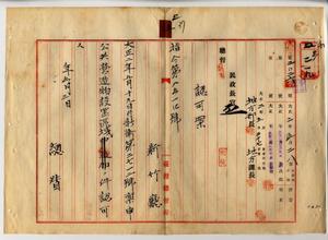 五 新竹庁長家永泰吉郎ヨリ明治四二年一二月一四日附指令第六三三七号ヲ以テ認可セラレタル公共営造物設立区域中竹北一堡埔頂庄ニ埔頂屠場ヲ竹南一堡北獅里興庄土名北獅里興ニ北獅里興屠場ヲ追加ノ稟申ニ付キ認可ス(指令第八六一四号)