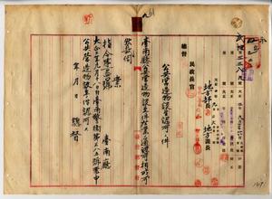 九 台南庁長松木茂俊ヨリ公共事業ニ属スル市場及ヒ屠畜場トシテ中洲市場ヲ学甲堡中洲庄ニ、帰仁南屠畜場ヲ帰仁南里帰仁南庄ニ、旧港口屠畜場ヲ仁寿上里旧港口庄ニ新設致シ度トスル公共営造物設立稟申ノ件認可ス(指令第一〇三四〇号)