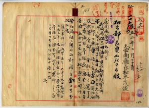 五 海軍次官財部彪ヨリ依頼ノ、打狗港内敷地ニ海軍省ノ施設ヲ設ケル為メ台南庁大竹里烏松庄ノ欧嚷、名川鑑、稲垣虎吉、吉田清二郎、孫心、石川昌次、許辨、業主王連管理人王戇ノ畑ト養魚池、業主福徳爺管理人許辨ノ廟宇一棟(移転ヲ要ス)ト墓ノ買収価格ノ取調及ヒ移転料其他補償等交渉並ニ業主権移転ニ係ル全テノ業務ヲ依頼サレタルニ付キ、其ノ買収ノ手続執行方台南庁長ノ通牒並ニ台南庁長松木茂俊ヨリ地方部長亀山理平太ヘ打狗烏松庄第一回海軍買収地登記済報告ノ件
