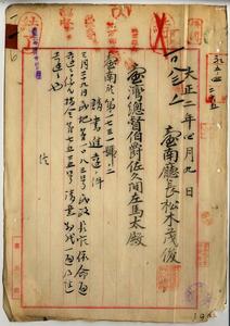 一 大社公学校管理者台南庁長松木茂俊ヨリ官有地ノ台南庁長沼二図里大湖庄ノ建物敷地ヲ大社公学校大湖分校新築敷地トシテ無償貸下ヲ願出タルニ付キ許可ノ件(指令第七五二五号)並ニ同管理者ヨリ提出サレタ請書ニ付キ台南庁長松木茂俊ヨリ進達ノ件(尚、本件は大正二年二月二八日付台南庶第一二九五号を以て「官有地無償下付ノ件」として大社公学校管理者出願書が進達されたものであるが、本件は無料貸付を受けて使用することで出願の目的を達することができるものと判断され、改めて官有地無償貸下の件として出願し直させられたものである。この為、本件の起日は民地第七九五号大正二年三月五日立案・同六日決定の文書―当該台南庁長進達書は返戻されたため未綴―とした。)