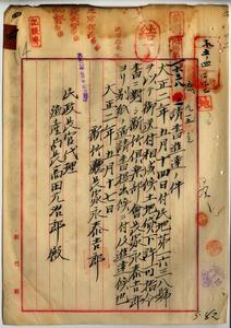 四 新竹倶楽部会長家永泰吉郎ヨリ願出ノ同倶楽部員ノ集会所トシテ使用スル目的ヲ以テ官有地新竹庁竹北一堡新竹街土名東門ノ建物敷地貸下ノ件許可(指令第八三七四号)並ニ同倶楽部家永会長ヨリ請書提出ノ件