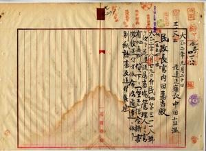 七 屠畜場管理人花蓮港庁長中田直温ヨリ花蓮港庁蓮郷花蓮港原野ノ官有原野地ニ屠畜場ヲ設クル為メ無料貸付ヲ出願シタルニ付キ認可ノ件(指令第九九二七号)並ニ同中田庁長ヨリ請書送付ノ件