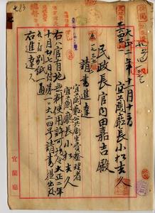 七 宜蘭庁公共衛生費整理者宜蘭庁長小松吉久ヨリノ公共用水道鉄管埋設ノ為メ宜蘭庁浮洲堡叭哩沙庄土名月眉官有道路ノ指定区間ヲ無償ニテ大正二年一〇月二七日ヨリ満二〇箇年使用方許可願ニ付キ許可ノ件(指令第一〇六二四号)並ニ宜蘭庁長小松吉久ヨリ請書進達ノ件