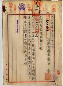 九 花蓮港庁蓮郷花蓮港街大日本武徳会台湾支部花蓮港支所長中田直温ヨリ花蓮港庁蓮郷花蓮港街弥生通ノ官有地ノ建物敷地ヲ武徳会演武場トシテ使用致度ニ付キ官有地無料貸付ヲ願出タル件認可(指令第一一〇八八号)並ニ花蓮港庁長飯田章ヨリ請書送付ノ件