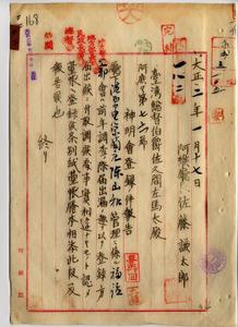 二二 阿緱庁長佐藤謙太郎ヨリ阿緱庁港西中里崇蘭庄陳山和管理ニ係ル福徳爺ハ届出漏ニ付キ神明会登録ノ旨報告ノ件