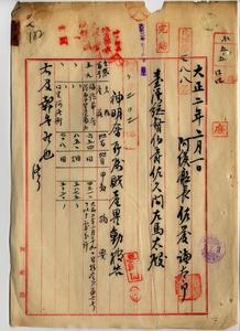 二七 阿緱庁長佐藤謙太郎ヨリ神明会所属財産異動トシテ福徳爺会ノ港西中里崇蘭庄ノ田ト畑及ヒ同里阿緱街ノ田ニ付キ処分許ヲ以テ報告ノ件