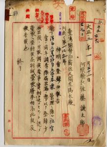 二八 阿緱庁長佐藤謙太郎ヨリ神明会登録トシテ阿緱庁港西上里竹頭角庄曽春霖管理ニ係ル社官届出漏ニ付キ登録方報告ノ件