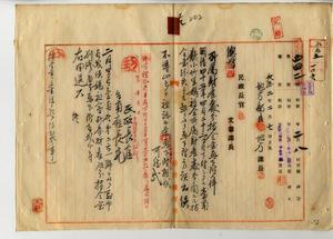 三三 台南庁小竹上里大樹脚庄ノ媽祖会管理人黄鶏哥ト会員総代ノ黄興・黄西湖、小坪頂区長陳開怡ヨリ媽祖会所有ノ台南庁小竹上里九曲堂庄ノ田ヲ塩水港製糖株式会社ノ九曲堂旗尾間専用鉄道敷地トシテ売却ニ付キ許可方願出ニ対シ許可ノ件(指令第一八二三号)並ニ媽祖会管理人黄鶏哥ヨリ右許可証紛失ニ付キ再下付ヲ願出タルニ依リ再下付スルノ件