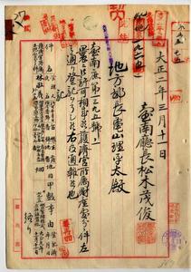 八 台南庁長松木茂俊ヨリ曩ニ御許可相成シ明治製糖株式会社設置地トシテ護済宮所属土地処分ニ付キ蔴荳堡溝仔掩庄ノ畑ニ付財産処分登記済ニ付通報ノ件