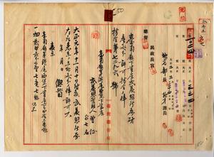 一一 台南庁茅港尾西堡下営庄ノ武承恩管理人ノ曽征・沈瑞建・姜林才貴・洪郡・陳■(ム+大+貝)・張草・武承恩信徒総代ノ呉沈分・姜林塗ヨリ公学校費ノ負担ヲ減少シ地方民力ノ休養ヲ図ルヲ目的トシテ武承恩所属財産タル台南庁茅港尾西堡下営庄ノ畑ヲ蔴荳公学校下営分校新築敷地トシテ寄附スルヲ以テ廟所属財産処分願ヲ許可ス(指令第七二九六号)