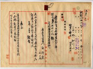 一七 台北庁基隆堡基隆街土名土名新店ノ慶安宮管理人許梓桑ト信徒総代ノ張達源・汪福蔭ヨリ基隆高砂公園区域ニ該当セル慶安宮所属財産中ノ基隆堡基隆街土名後井仔ノ建物敷地ト山林ヲ売却スルノ件許可ス(指令第七七七六号)