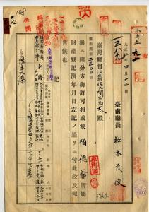 二四 台南庁長松木茂俊ヨリ曩ニ処分方許可サレタル福徳爺所属財産中台南公館ヘ敷地トシテ売渡シタル台南庁台南市ノ建物敷地ニ付キ財産登記済年月日報告ノ件