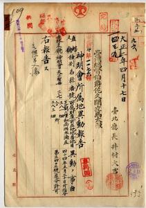 二五 台北庁長井村大吉ヨリ士林支庁管轄ノ神明会天上聖母所属ノ芝蘭二堡和尚洲水湳庄ノ畑ニ付キ移動報告ノ件