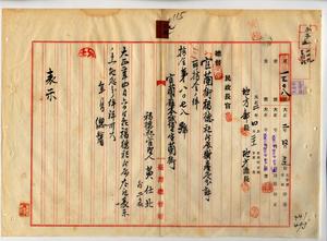 二七 宜蘭庁本城堡宜蘭街土名巽門ノ福徳祠管理人黄仕北ト信徒総代ノ林文富・林維圃ヨリ福徳祠所属財産ノ本城堡宜蘭街土名巽門ノ建物敷地中宜蘭街道路敷地トシテ寄附ノ件許可ス(指令第八〇七八号)