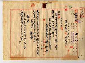 三五 台北庁大加蚋堡艋舺八甲街ノ有応公管理人林和尚ト信徒総代ノ林元・林金烏ヨリ有応公ノ建物ハ有応公業地ニシテ土塊造リノ建物ニテ各信者ノ納骨堂トシテ活用シ毎年三月・七月・十月・ノ三回管理人ニ於テ祭典施行シタルガ該地ハ市区改正且ツ市中ノ為メ今後モ納骨施設トシテ存続セルハ能ハザルニ依リ新築移転スベク大正元年九月文山堡頂内埔庄ノ山地ニ新築移転スルコトトナリタルニヨリ本地ヲ売却シ移転費及ヒ従来ノ祭典費ノ負債償却ニ充用到度ニ付キ有応公建物敷地売払願ノ件台北庁長井村大吉ヨリノ売却処分方ニ付キ副申モアリタルニヨリ許可ス(指令第八一三六号)