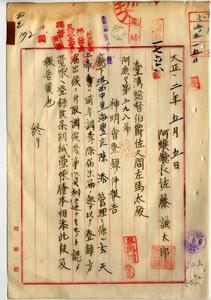 四三 阿緱庁長佐藤謙太郎ヨリ神明会ノ阿緱庁港西中里海豊庄陳添管理ニ係ル玄天上帝ノ登録方届出洩ノ為メ台帳ヘ登録ニ付キ報告ノ件