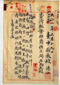 四九 祠廟福徳爺管理人詹章ヨリ福徳爺附属財産ニ付キ届出アリタルニヨリ台中庁長枝徳二ヨリ本島ノ旧慣ニ依ル社寺廟宇台帳社寺廟宇ノ部二林支庁第三〇号登録洩アルニヨリ報告ノ件