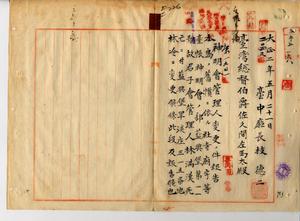 五二 台中庁長枝徳二ヨリ本島ノ旧慣ニ依ル社寺廟宇等台帳神明会ノ部藍興堡第一一号故君子会管理人林満漢死亡ニ付キ管理人ヲ林冷ニ変更シタルニ付キ報告ノ件