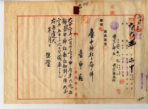臺中神社縣社加列稟申聞屆ケラル旨通達(台中廳)