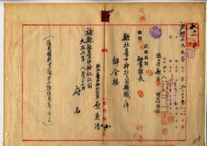 四 台中庁長枝徳二ヨリ県社台中神社崇敬者総代小畑駒三・山移定政・坂本素魯哉・安土直次郎・小塩元太郎・呉徳功・林烈堂ヨリ台中神社社掌原兼清ヲ台中神社社司ニ補命願ノ件許可ス