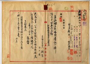 九 阿緱庁長佐藤謙太郎ヨリ阿緱庁港西中里海豊庄神明会三山国王管理人胡塗・会員総代鄭煥春・同卜興・会員胡騫・同林掌ニ阿緱区長許宗朝ヨリ三山国王ノ公業地ヲ売却シ負債償却ヲ願出タルノ件許可ス(指令第一〇五九三号)
