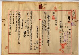 一三 嘉義庁大槺榔西堡東勢藔庄聖母会管理人黄厘、派下総代張去、同黄謀ヨリ昨年ノ暴風雨ニヨリ破損シタル祠廟修繕ノ為メ聖母会ノ土地ヲ明治製糖株式会社ニ売却致度トノ願出ノ件ヲ許可ス(指令第一〇六八七号)