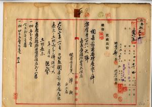 一四 嘉義庁大槺榔西堡太保庄ノ関帝爺管理人潭欧、派下総代雷張・同楊石頭ヨリ昨年ノ暴風害ニヨリ破損シタル祠廟修繕ノ為メ関帝爺ノ所属地ヲ明治製糖株式会社ニ売却致度トノ願出ヲ許可ス(指令第一〇六八六号)