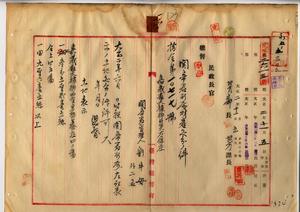 一六 嘉義庁大槺榔西堡太保庄関帝君管理人劉牛母・派下総代傅肯・同郭福ヨリ昨年九月ノ暴風ニヨリ破損シタル祠廟修繕ノ為メ関帝君ノ所属地ヲ明治製糖株式会社ニ売却到度トノ願出ヲ許可ス(指令第一〇七一七号)