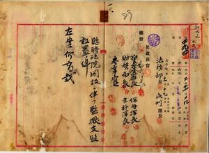 一〇 臨時法院開設ニ伴ヲ監獄支監ヲ設クル為メ明治四二年一〇月府令第七九号監獄支監名称位置中ヲ追加シ新竹庁苗栗ニ台北監獄苗栗支監ヲ設置スルノ件並ニ台北監獄長典獄志豆槇源太郎ヨリ監吏日下部小太郎ヲ苗栗支監長ニ任命シ一一月二五日ヨリ事務ヲ開始シタル旨報告ノ件(府令第一〇一号)