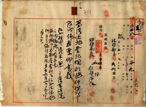 二三 法務部長ヨリ司法省民事局長ヘ改正不動産登記法ノ施行日ニ関スル問合セヲ踏エ明治三八年六月府令第四三号台湾土地登記規則施行規則中改正ノ件(府令第五五号)