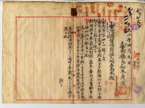 一五 台南庁長松木茂俊ヨリ稟申ノ台南尋常高等小学校安平分教場(台南庁効忠里安平街)、台南尋常高等小学校大目降分教場(同庁大目降里大目降街)、蔴荳尋常小学校(同庁蔴荳堡蔴荳庄)、橋仔頭尋常高等小学校(同庁仁寿下里橋仔頭庄)、台南女子公学校(同庁台南市辛一三二)、安平公学校永寧分校(台南市効忠里湾裡庄)、安平公学校塩埕分校(同里塩埕庄)、大目降公学校山仔頂分校(同庁新化東里山仔頂庄)、湾裡公学校直加弄分校(同庁安定里東堡直加弄庄)、噍吧哖公学校南庄分校(同庁内新化南里南庄)、埔姜頭公学校(同庁永康上中里埔姜頭庄)、鳳山公学校港仔茄分校(同庁鳳山下里港仔茄庄)、鳳山公学校山仔頂分校(同庁小竹上里仔頂庄)・阿公店公学校梓官分校(同庁仁寿上里梓官庄)・大社公学校頂茄逝分校(同庁文賢里頂茄逝庄)・大社公学校大湖分校(同庁長治二図星大湖庄)・蔴荳公学校下営文分校(同庁茅港尾西堡下営庄)・蔴荳公学校後営分校(同庁西港仔堡後営庄)・六甲公学校内庄分校(同庁善化里西堡内庄)・港仔茄尋常小学校(同庁鳳山下里港仔茄庄)ヘ教育ニ関スル勅語謄本御下賜願禀申ニヨリ台南庁長ヘ下付ノ件及ヒ台南庁長松本茂俊ヨリ大正二年三月一日台南庁公室ニ於テ台南尋常高等小学校長神田辰次郎、台南女子公学校長吉津邦喜・安平公学校長中条文四郎・大目降公学校長小田平六・湾裡公学校長関菊次郎・噍吧哖公学校長万羽三次郎・埔姜頭公学校長金丸市作・鳳山公学校長高岡武明・阿公店公学校長河原寿夫・大社公学校長深堀小平・蔴荳公学校長代理同校教諭笠原憲一郎・六甲公学校長田口倭三郎ヘ授与セラレタル旨報告並ニ同上各校長(但シ蔴荳公学校長中村亀吉及ヒ橋仔頭尋常高等小学校長平井寛)ヨリ提出ノ教育ニ関スル勅語謄本奉戴式挙行ニ関スル報告書奉呈ノ件