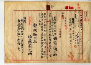 六 静岡県小学校本科正教員免許状ヲ有スル静岡県田方郡中狩野尋常高等小学校訓導兼校長佐藤亀之助(本籍地静岡県田方郡対馬村八幡野・明治一二年二月二六日生・静岡県師範学校卒)ヨリ尋常小学校本科正教員無試験検定出願ニ付キ免許状授与ノ件