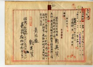 一二 台湾公学校教員免許状ヲ有スル台湾総督府西螺公学校訓導劉英賢(本居地嘉義庁西螺堡西螺街・明治二一年七月一四日生・台湾総督府国語学校師範部乙科卒)ヨリ公学校訓導無試験検定出願ニ付キ免許状授与ノ件