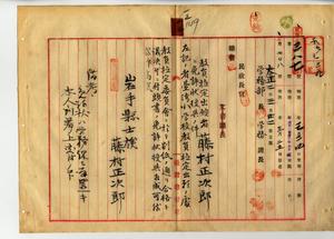 一三 明治二三年七月一四日ヨリ明治二八年七月一三日マテ五年間岩手県管内小学校教員免許状及ヒ岩手県小学校本科正教員免許状ヲ有スル元岩手県盛岡市盛岡尋常高等小学校訓導藤村正次郎(本籍地岩手県岩手郡浅岸村大字浅岸・明治元年二月一二日生・岩手県尋常師範学校卒)ヨリ尋常小学校本科正教員無試験検定出願ニ付キ免許状授与ノ件